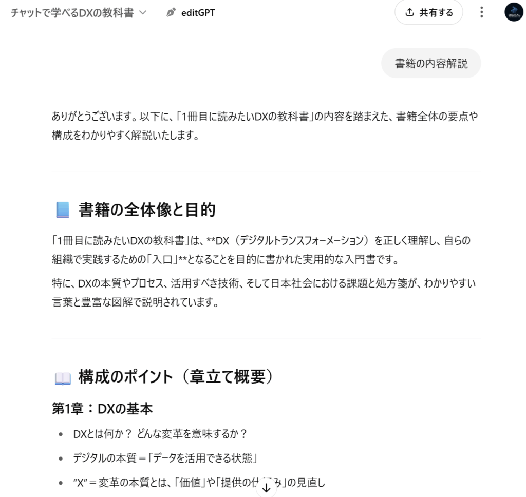 ChatGPTに『1冊目に読みたいDXの教科書』の書籍データを1冊まるごと学習させました。