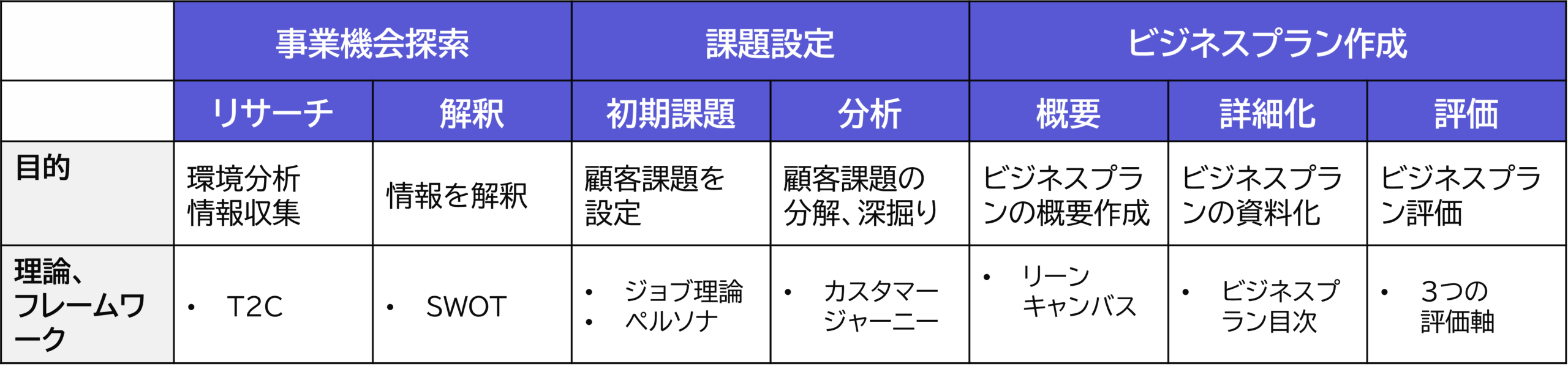 新規事業創出プロセスと各プロセスで活用する理論・フレームワークの全体像を示します。